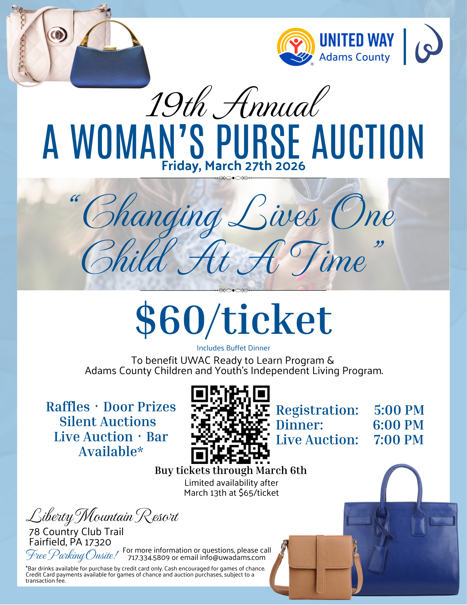 Join us for the 19th annual A Woman’s Purse Auction to benefit United Way’s Ready to Learn and the County’s Independent Living Program. Help us raise $40,000 for the youth of Adams County! Enjoy games of chance, dinner, and both our live and silent auctions all at the beautiful Liberty Mountain Resort. Tickets are $60/guest and available through March 6th. If you are interested in donating a purse, pursuing a sponsorship, or have questions about attending the auction, more information is available at uwadams.org/purse/